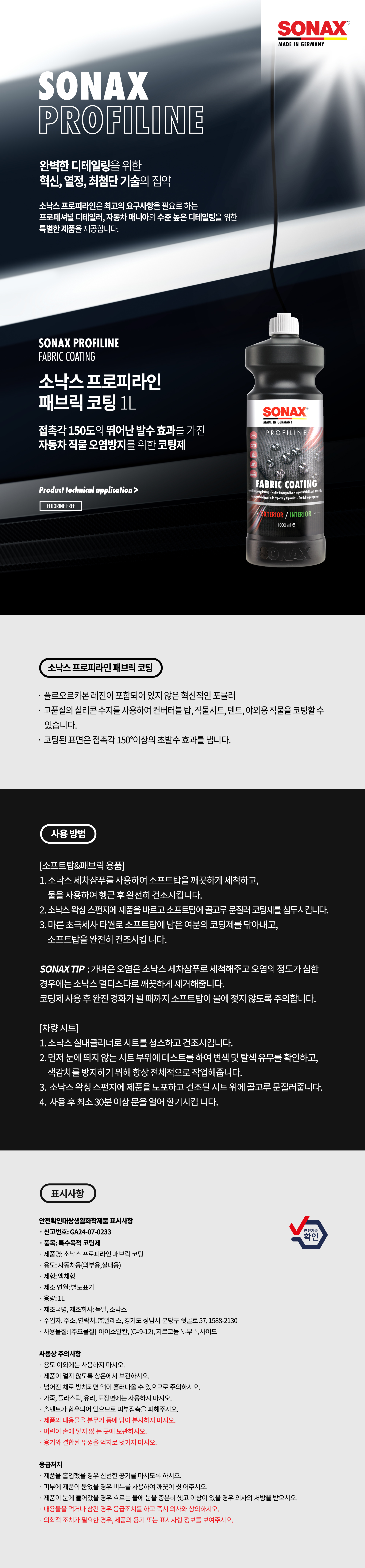 SONAX 소낙스 프로피라인 패브릭 코팅 1L 실내 직물 시트 초발수